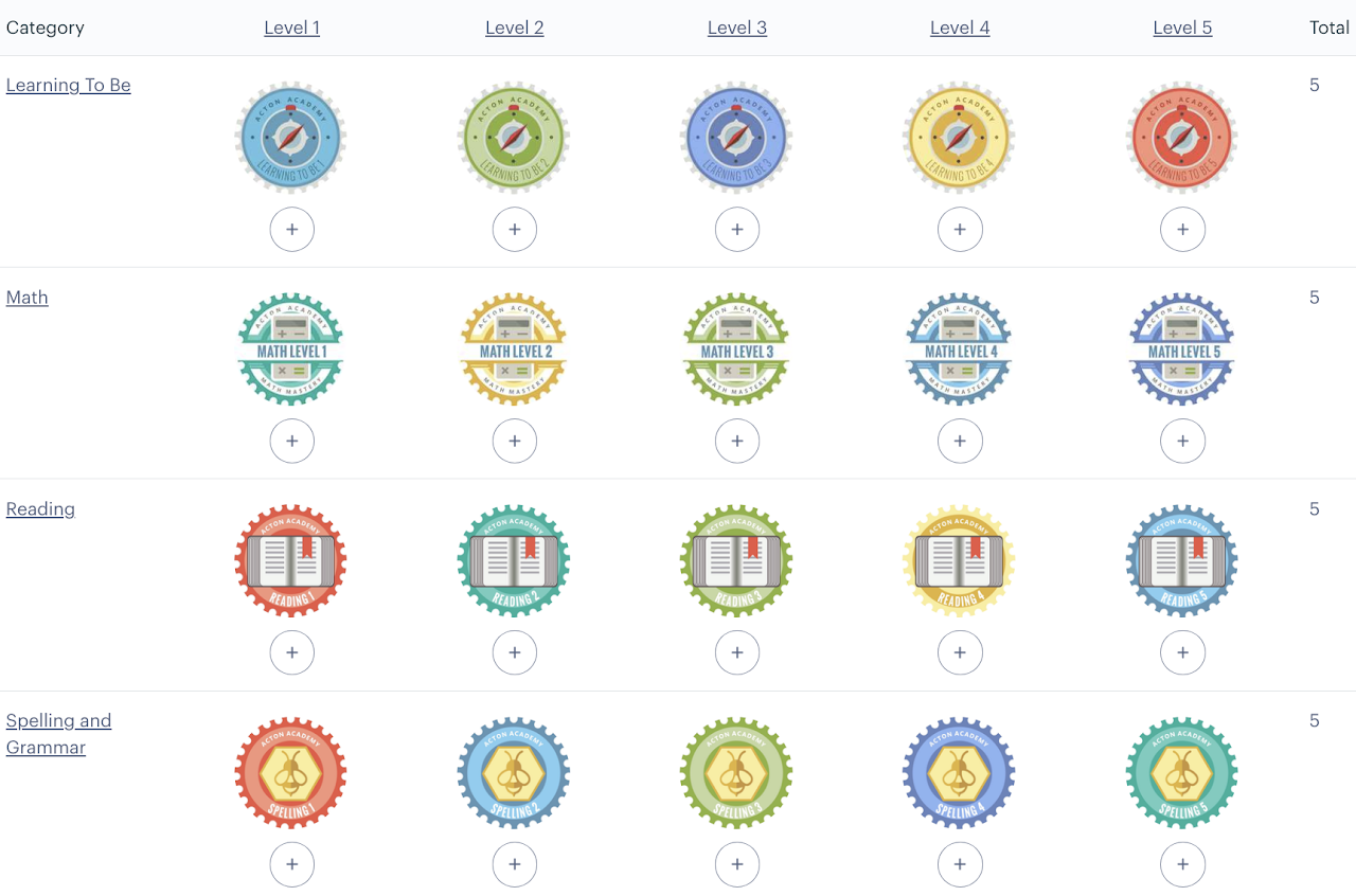 Badges are used to track academic progress in Core Skills like reading, writing, math, and spelling and character development as well as showcase other excellent work or mastery of useful skills.